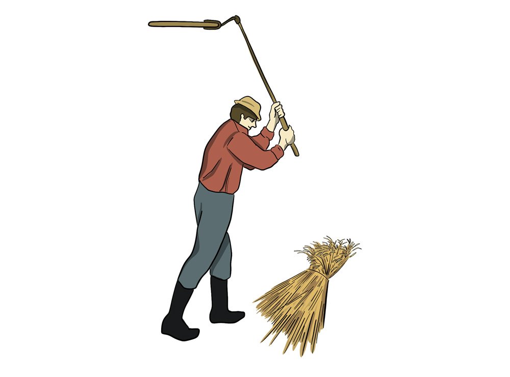Combines were a major improvement in equipment used for the harvest season. The early farmers would harvest their crops by hand. Grain or hay was cut with a scythe and left to dry in the sun. A cradle scythe (also called a hand cradle) cut the hay and dropped it into piles. The grain was left to dry out and then farmers would separate the kernels from the chaff by hitting the stalks with a wooden flail. This would allow them to winnow the grain to separate the kernels from the chaff.