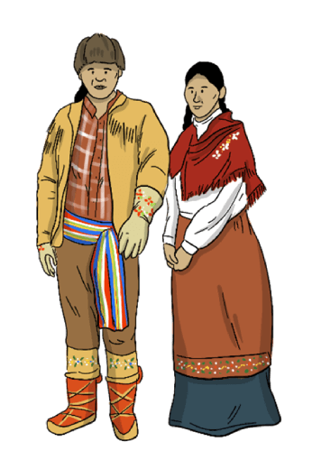 Métis clothing was a combination of styles from their First Nations and European ancestors. The Métis women were responsible for making all the clothing, they used animal hides for vests, coats, and moccasins. They would trade goods for cloth and would purchase material for dresses and children’s cloths at trading posts. Métis clothing like coats, mittens, moccasins, vests, and bags were beaded with decorative floral beadwork.