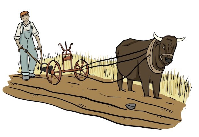An oxen is being used to plow the prairie sod to break it down so that a crop can be planted.