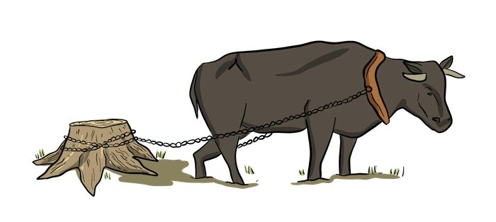 An oxen is being used to clear the trees, stumps, and rocks from the land.