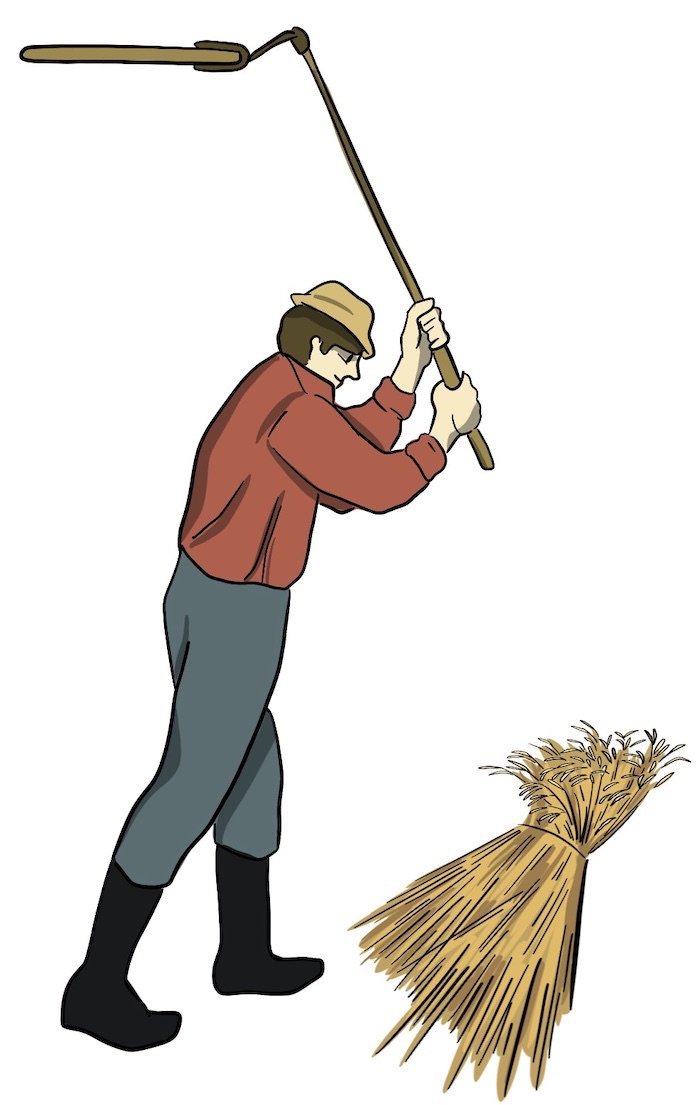 Grain or hay was cut with a scythe or a sickle and left to dry in the sun. A cradle scythe (also called a hand cradle) cut the hay and dropped the hay in piles.