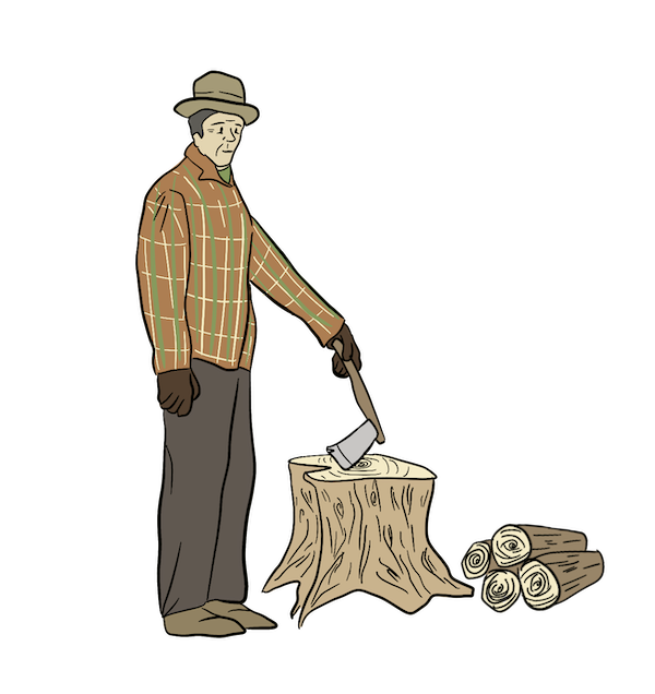 A settler has just finished chopping wood using an axe.