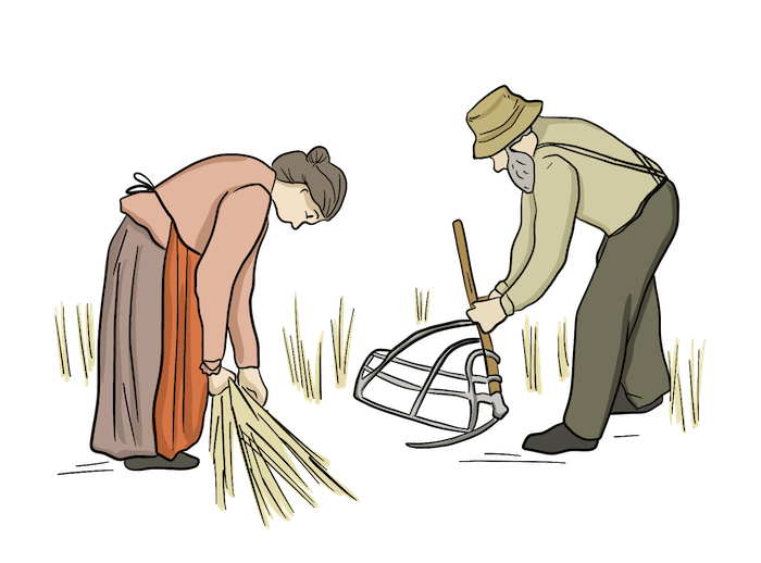 These settlers are pictured using a wooden rake, a pitchfork, and a broom.