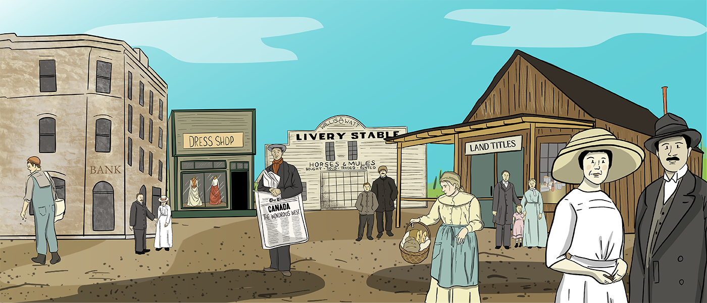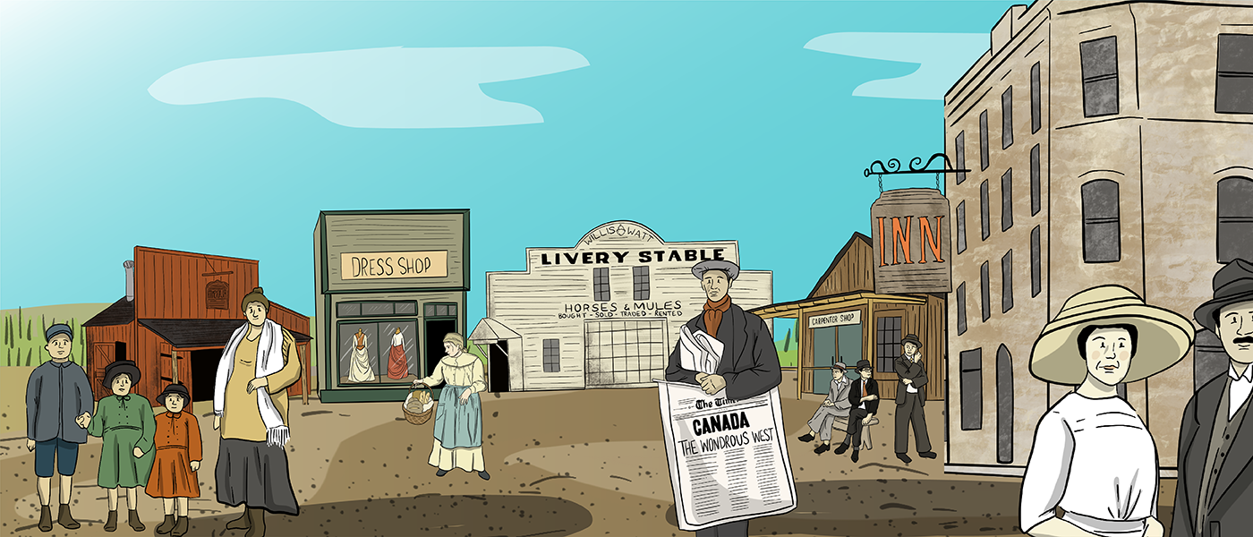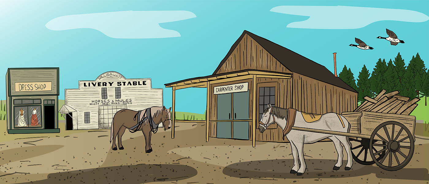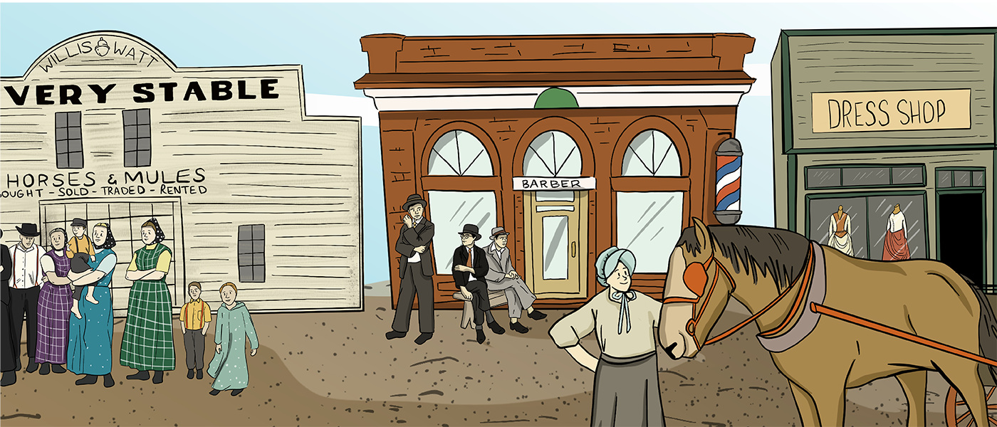 Towns Back to Past Overview Barbershop Blacksmith Shop Carpentry Shop Churches Dress Shop Doctors & Pharmacy General Store Harness Shop Inn & Livery Stable Land Titles & Banks Post Office Printing Shop Telephones Train Stations & Grain Elevators