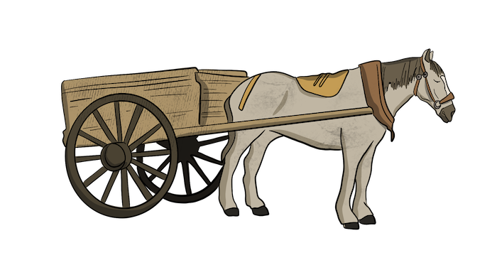 An illustration of a harness shop is shown with large double doors that are open.