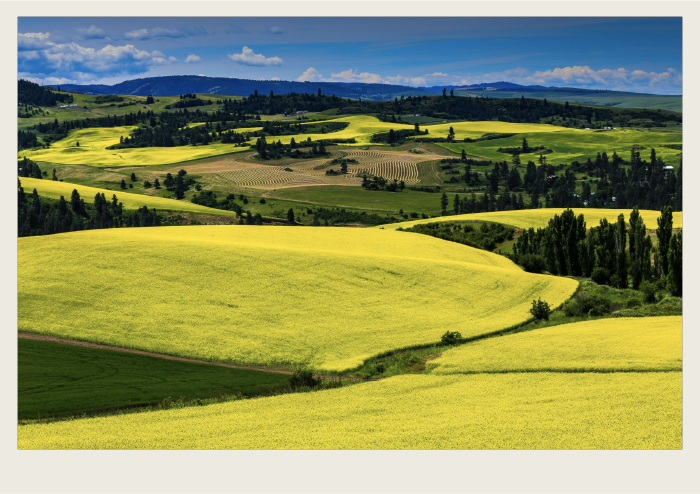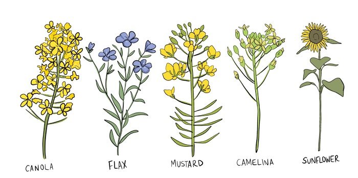 Canola, flax, mustard, camelina, and sunflowers are all oilseed crops that grow in Saskatchewan.