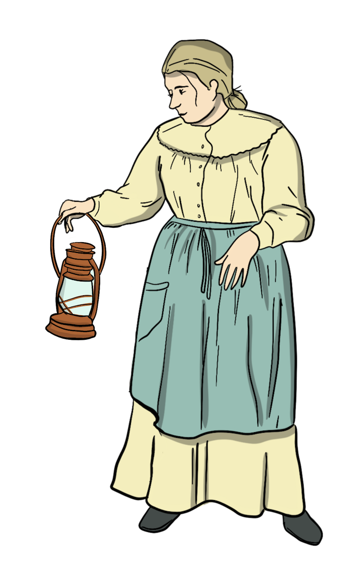 An illustrated train is moving across a landscape that has pine trees, farm fields, and a canola crop.